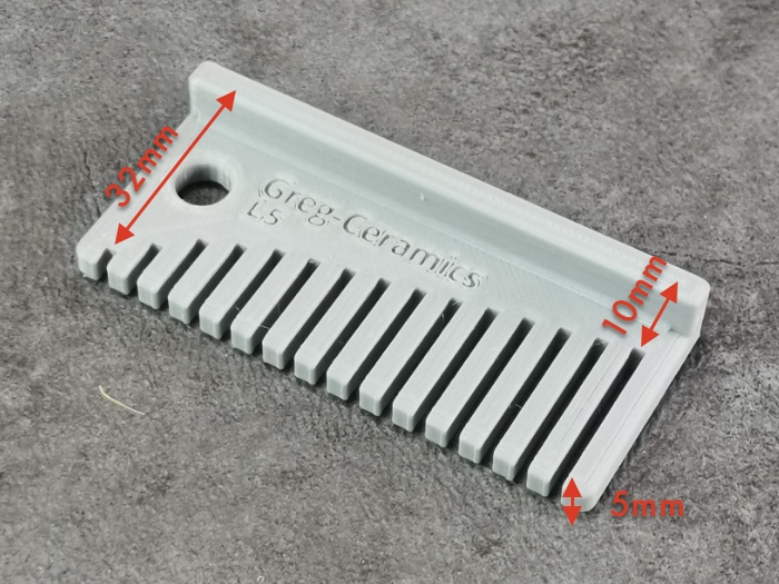| Matériau : PLA (impression 3D). Couleur aléatoire. Hauteur : 5 mm. Modèle avec rebord en “L”, conçu pour guider une mirette le long du bord d’une poterie. L’espace de 1,75 mm entre les dents permet d’y glisser une mirette fine. Les différentes dents servent à choisir la distance entre le bord du pot et la mirette, pour creuser à largeur régulière. Le rebord en “L” offre un appui stable contre le bord du pot. | |