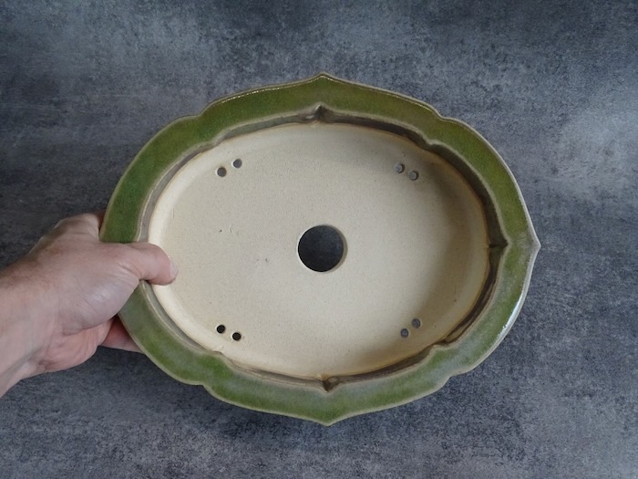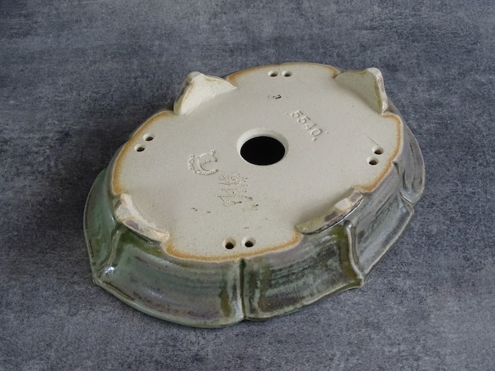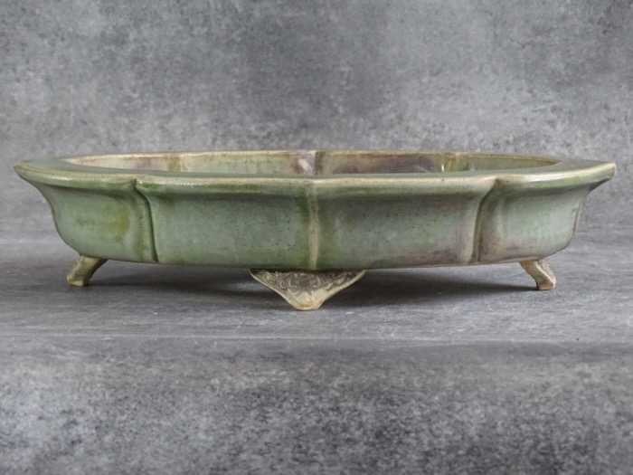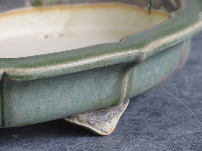 | This mokko pot, with its apple-green glaze tinged with gray, is perfect for maples or deciduous trees. Its sculpted feet and unique patina bring natural elegance, ideal for enhancing an organic-style bonsai. | |